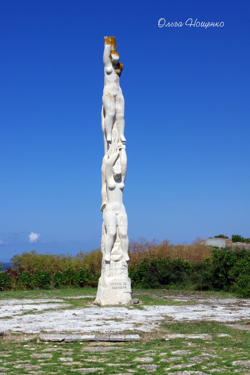 Мыс Калиакра встретил нас интересным памятником. Оказалось, что этот памятник посвящён исторической легенде: «Это случилось во времена турецкого ига. Крепость Калиакра пала последней в боях против войск султана. 40 местных девушек, не захотевших быть рабынями-наложницами, предпочли для себя смерть. Перевязавшись косами, они (все сорок были девственницами) бросились в море с мыса, погибнув в морской пучине. В результате скалы окрасились в красный цвет, цвет крови гордых и свободолюбивых болгарок. Это место зовется Бухтой боли. Знатоки утверждают, что здесь самое-самое чистое Черное море». Нам рассказали, что даже известны имена всех сорока девушек и их собираются канонизировать...