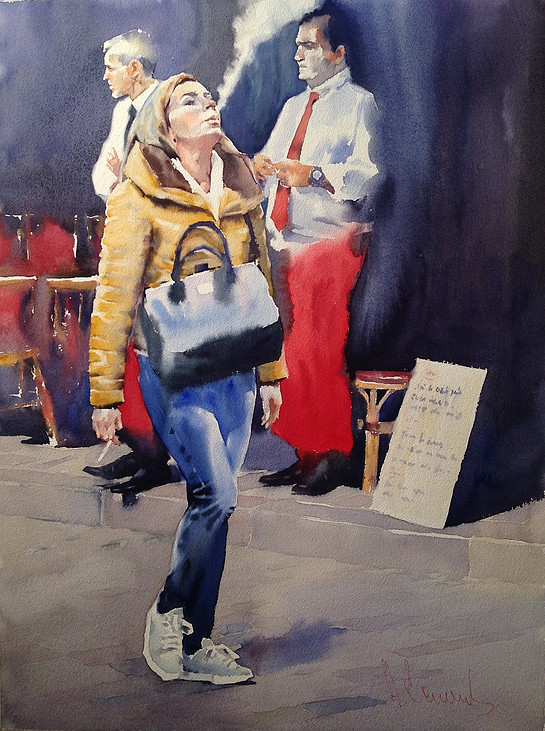 Сначала идут подготовительные наброски, потом я собираю из них некую композицию, как коллаж. И прежде, чем начинать работать уже цветом, я сначала все должен продумать, вплоть до малейших деталей. У меня в голове должна быть полностью законченная работа. На самом деле, акварель приучила меня и с маслом работать так же. Хотя с маслом, конечно, немного попроще. Но все равно много, набросков, однако это классика, по-другому нельзя, иначе, считай, это пренебрежение к искусству.