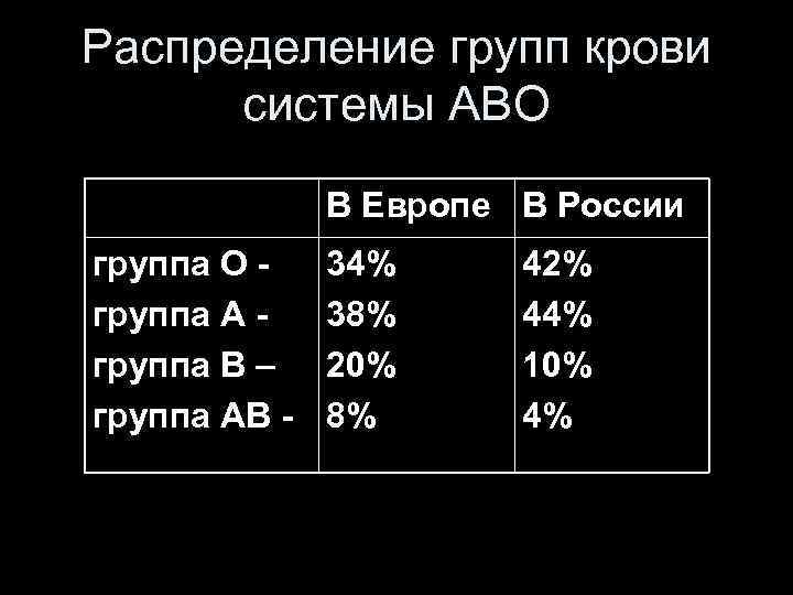Нашел вот табличку по нашей стране и Европе в целом. Она, конечно, не отражает всей действительности, но во многих статьях и журналах, а также справочниках, цифры примерно схожи. Что мы видим из этой таблицы то, что людей с 4 ой группы крови в принципе меньше встречается. В свое время я занимался вопросом статистики и ради интереса спрашивал у знакомых у кого какая группа крови, так из всех моих знакомых чаще всего были 1 и 2, 3 реже, 4 только 2 человек вспомнил. Это еще в школе было.