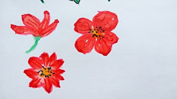 3. Для оформления цветов используйте яркий оттенок, например, красный. Прикладывая кончик кисточки, смоченный в воде и краске, выведите продолговатые