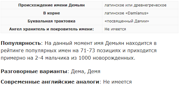 Мужское имя Демьян имеет латинское происхождение. Образовано от слова «Damianus», имеет трактовку «посвященный Дамии» (в мифологии Древней Греции была богиней изобилия и плодородия). Также может иметь трактовку «усмирять» или «покорять». В наши дни вновь стало пользоваться популярностью в русскоговорящих странах. Имеет мощную энергетику и наделяет носителя достаточно интересным и положительным характером, большинство характеристик которого формируются еще с детства. Как правило, все Демьяны это спокойные и красноречивые, доброжелательные и деликатные, уступчивые и покладистые люди. СМОТРИТЕ ВИДЕО - ПОДРОБНЕЕ ТУТ Источник - Значение имени Демьян: карма, характер и судьба
