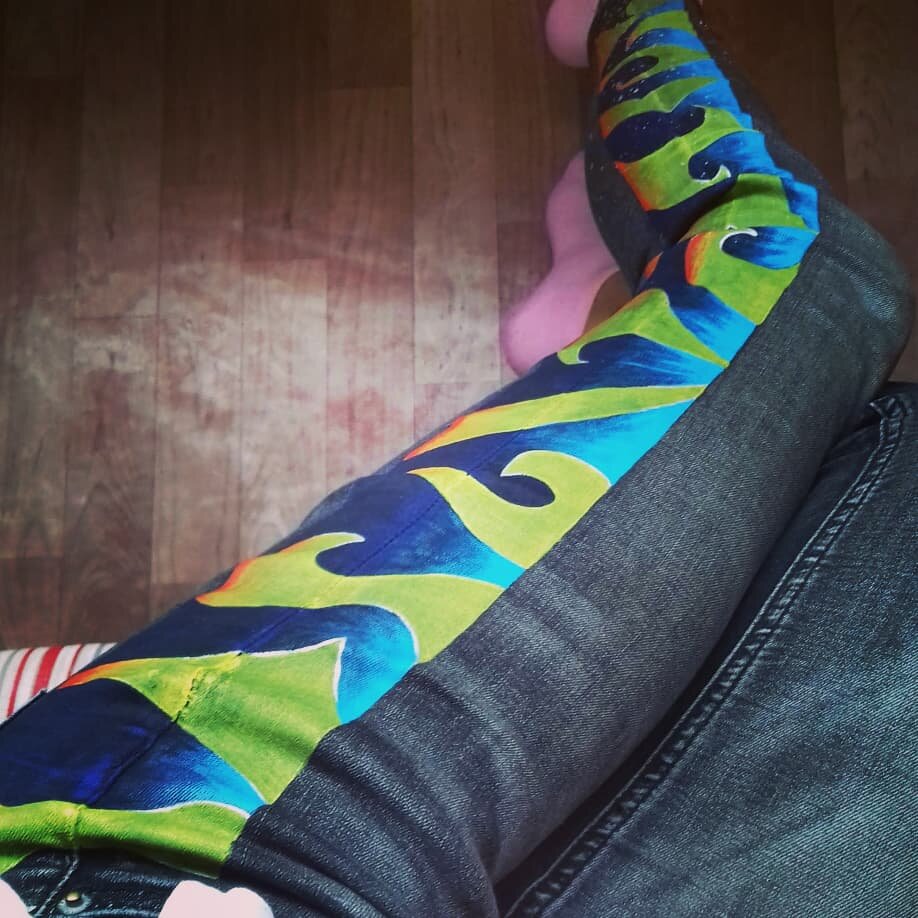 Снова джинсы для неотразимой моей Сестры. В этот раз я была совершенно свободна в выборе размера, цвета и местоположения рисунка, поэтому, учитывая иногда накрывающий меня гигантизм, получился не лампас, а Лампасище! Каждый видит здесь своё, кто-то северное сияние, а кто-то как идёт снег, горит огонь и видно заснеженную даль, а что видите Вы?