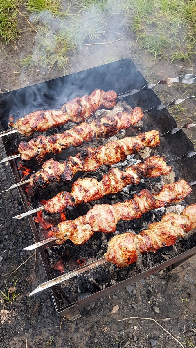 - Нанизываем мясо на несколько шампуров. При желании, вместе с мясом можно нанизывать кусочки овощей. Жарить над углями до готовности.