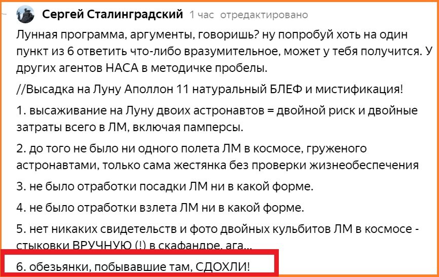 Суть аргумента от Сталинградского (не его, он просто перепостил, но да ладно) - американцы запускали на Луну обезьян, те побывали там, вернулись на Земли и сдохли. Тем самым доказав, что полеты на Луну невозможны.