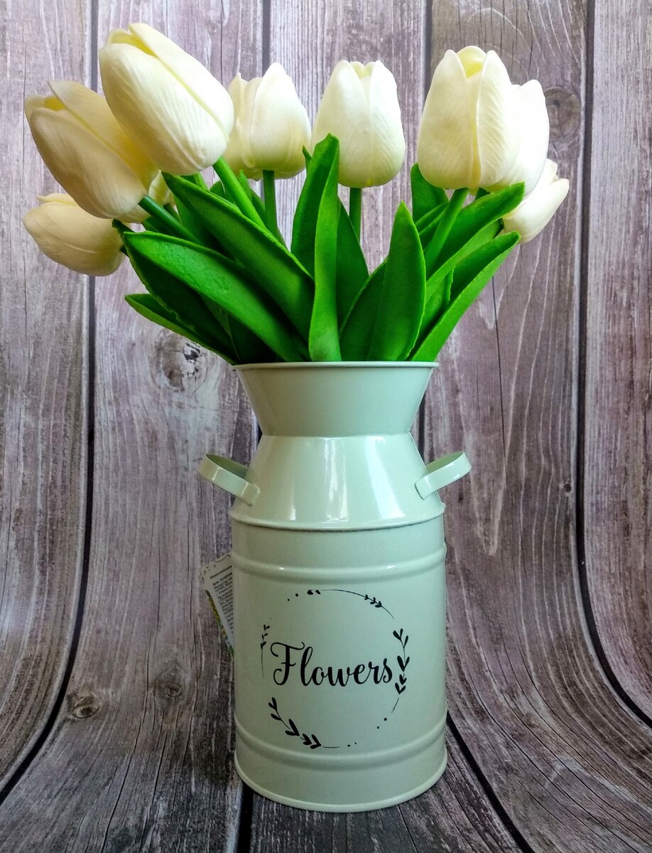 Вообще вазу я особо не планировала. Тем более гнутую. Но пазл сошёлся так точно, словно кто-то специально подсовывал кусочки на свои места. Специально для меня, специально для этого дня и для этого полураздолбанного куска крашеной жести. Нет, правда, вы видели эти швы? Возможно другие экземпляры выполнены аккуратнее, но мне достался откровенно кривой. В общем Его Величество Случай во всем его великолепии. Второе имя Случая - Рок. И кто я такая чтобы ему противостоять. Тем более что цена вопроса 200 рублей. Для вазы вообще считай даром. А для кошачьего здоровья и моего спокойствия и вовсе бесценно. Даже не знаю есть ли другие варианты расцветок: ни до, ни после этой вазы в продаже не видела. Моя - молочно-зелёная пастель. Был бы выбор - взяла бы белую. Скажите, кто-нибудь видел в продаже другие цвета? Ваза в форме молочного бидона. Высота 19 сантиметров. Диаметр дна - 10. Для моих цветочков - в самый раз. Идеально подойдёт для интерьеров в стиле прованс или шебби-шик, но в целом н