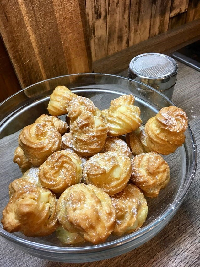 Ингредиенты: Мука - 230 г Маргарин - 1 ст. л. Яйцо - 7 шт. Соль - 1/5 ч. л. Сахар - 1/2 ч. л. Сметана густая - 200 г Сахарная пудра - 1/2 стакана Ванильный сахар - 1/2 пакетика Вода - 1 стакан Орехи измельченные жареные - 2 ст. л. Приготовление: Воду вскипятить, добавив соль и сахар, перемешать, чтобы сыпучие продукты полностью растворились. Затем, не снимая с огня, добавить порубленный на кусочки маргарин. Перемешать, чтобы маргарин растаял и всыпать просеянную муку. Варить помешивая 5–7 минут. Тесто снять с огня и охладить. После этого взбить тесто миксером, постепенно добавляя яйца. Выложить тесто в кондитерский мешок с насадками. Отсаживать заварное тесто на противень смазанный маслом заварные пирожные на расстоянии друг от друга в виде лепешек. Можно выкладывать ложкой. Выпекать эклеры при 180 градусах до светло-коричневой корочки. После этого выпечку остудить. Для крема взбить миксером сметану до устойчивой пены, добавляя сахарную пудру и ванильный сахар. В самом ко