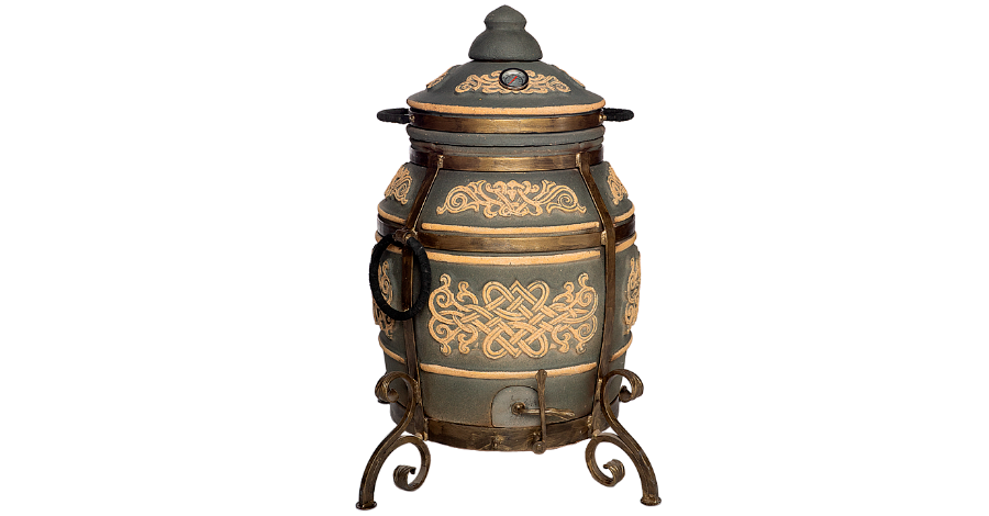 Производитель предлагает данный тандыр в двух расцветках – графит и морская волна. Изготовлен он из огнеупорной глины, по традиции с красивым орнаментом на корпусе. Присутствуют обязательные кованые полоски, которые переходят в удобные и устойчивые ножки.