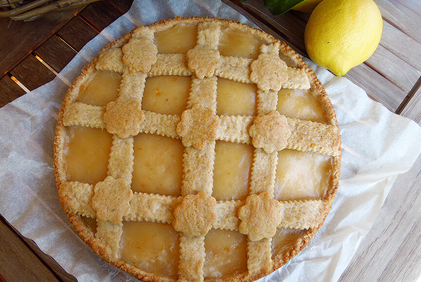 В форму для выпечки выложить 2/3 части охлажденного теста, формируя бортики. На тесто ровным слоем выложить лимонный крем. Оставшуюся часть теста раскатать и нарезать на полоски. Верх пирога украсить полосками теста в виде сетки, либо можно просто накрыть раскатанным куском теста. Выпекать лимонный пирог в разогретой до 180 градусов духовке 30 минут.