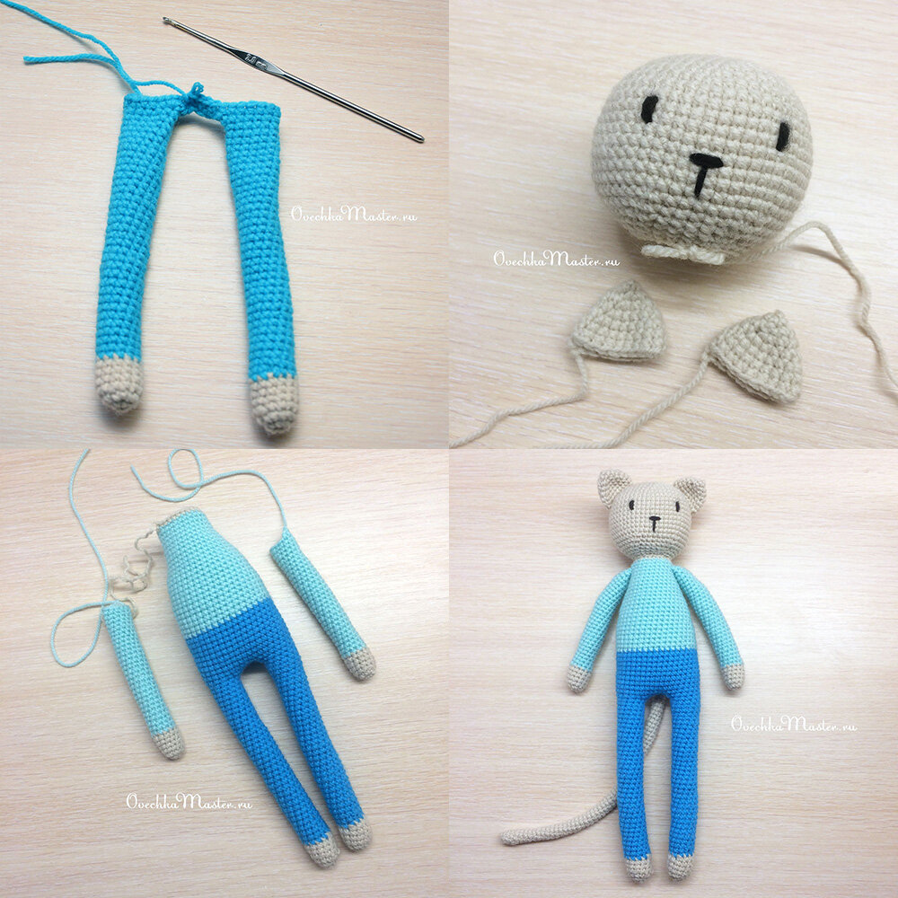 Большинство подобных игрушек вяжут следующим образом. Отдельно вяжут туловище (начиная с ног) и отдельно голову, руки и другие элементы (уши, хвосты и так далее). А дальше все сшивается.