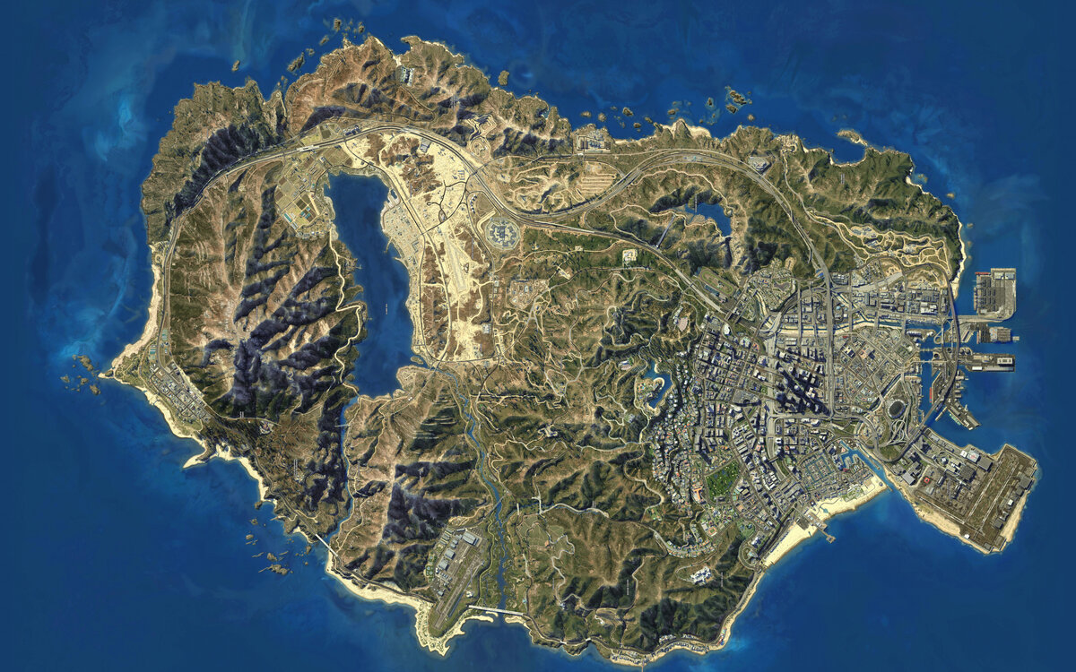 Карту игры составляет прототип города Лос Анджелес - Лос Сантос. Проработанная инфраструктура, красивые ландшафты, интерактивные помещения создают атмосферу реального, огромного города.