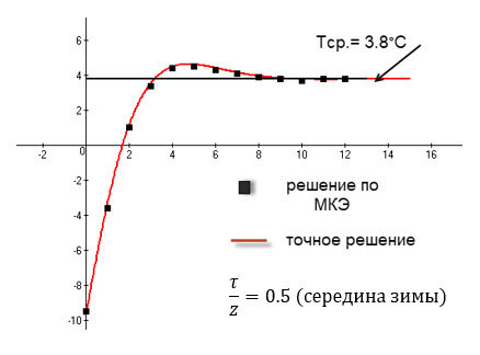 После изучения книги "Теплопередача" (Шорин С. Н., 1964 г.) пришлось внести некоторые изменения в методику расчета. Здесь остановлюсь только на основных моментах, а полный текст презентации скачайте по ссылке. В частности, по нижней границе теперь используется условие Q=0. Сравнение точного решения и решения по МКЭ показало отличное совпадение (см. рис.) Теперь температура грунта на глубине > 10 м совпадает со среднегодовой температурой воздуха. Данная методика была использована для оценки эффекта утепления фундамента мелкого заложения слоем пенополистирола. Расчеты показывают, что утепление слоем пенополистирола уменьшает глубину промерзания на 0,4 - 0,5 м.