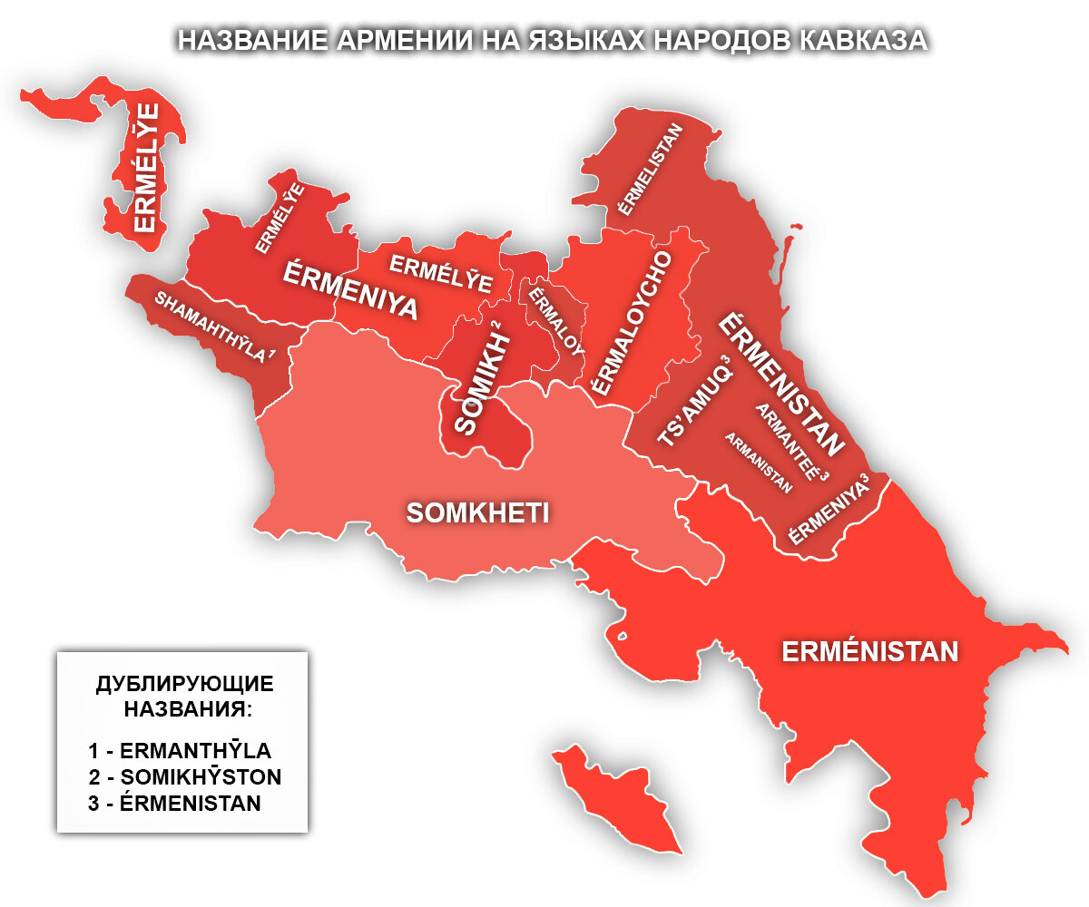 Наиболее распространенные в мире названия Армении происходят от древнегреческого Arménioi и древнеперсидского Arminiyaiy. На Кавказа помимо своих вариаций этого этнонима, имеются и местные, уникальные названия Армении. Ряд народов Кавказа и вовсе имеют по 2 названия Армении. ЕЩЕ СТАТЬИ ОБ ЭТНОНИМАХ АРМЯН