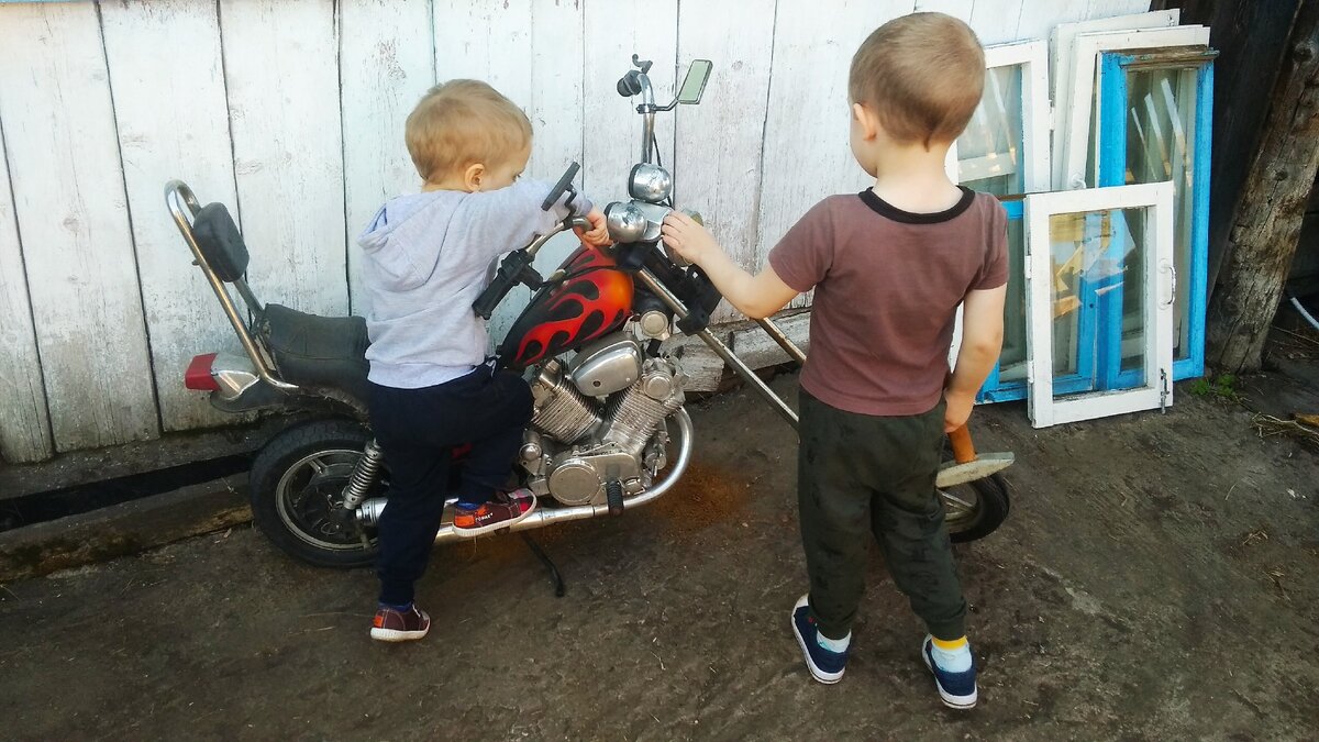 Настоящая детективная история у меня тут приключилась. С женой были в деревне на огороде, а сынули игрались в ограде. Решили пойти передохнуть, да посмотреть на пацанов, которые давненько не забегали на огород. Хотя слышно было что они там копошатся и что-то активно обсуждают. А там вот такая картина: Всё бы ничего, да вот только технику эту мы увидели в первый раз. Я тут же бросился выяснять откуда у нас взялся этот маленький Harley-Davidson, но внятного ответа от своих сорванцов так и не получил. Старший только сказал, что он не рабочий и его нужно починить, при этом постукивал по нему молотком со всех сторон. Выглядит мотоцикл как настоящий, просто маленький и не сразу догадался, что это электрический мопед. Но посмотрев поближе, стало понятно, что бензобак и мотор у него бутафорские. Да и стало понятно, что этот "Harley-Davidson" вряд ли ездил в последнее время — весь грязный, в паутине и даже местами покрыт мхом. Ну что делать, решил идти искать хозяина. Дети ещё маленькие (