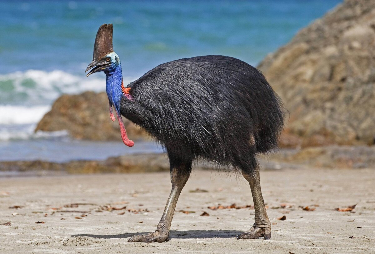 Отряд казуарообразных включает два семейства: Казуары и Эму. Это крупные трёхпалые птицы с сильно редуцированными крыльями, так что летать они не могут, ноги — относительно более короткие, чем у других бескилевых. Голова оперена слабо. Перья — волосовидные, имеют добавочные стержни. Заботу о потомстве у казуарообразных проявляет только самец: именно он строит гнездо, высиживает яйца и ходит с выводком. Ныне казуарообразные живут в Новой Гвинее, Австралии и на близлежащих островах. У казуаров на голове имеются дреды («шлем»), а на шее присутствуют голые участки ярко окрашенной и утолщённой кожи. Общая окраска — чёрная. Масса 80—90 кг. На крыльях располагаются длинные роговые стержни, перья в виде длинной щетины. Внутренний палец имеет острый коготь, служащий для защиты. Питаются плодами, семенами, насекомыми. Могут бегать со скоростью до 40 км/ч, вытянув вперёд голову, защищенную «шлемом», тогда как тело, прикрытое с боков роговыми стержнями, легко раздвигает заросли, хорошо плавают.