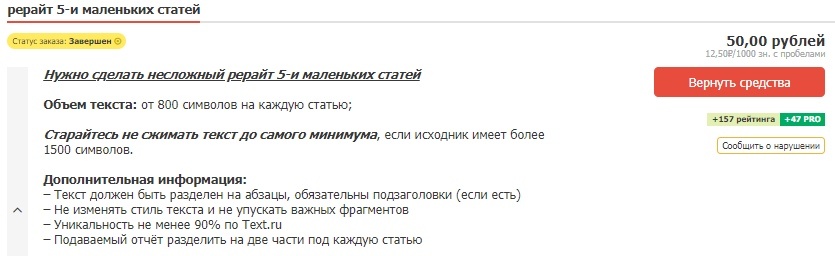Отдельно хочется рассказать про прекраснейших заказчиков и их отношение к исполнителям, как к пустому месту. Любое трудолюбие и желание работать разбивается об банальный непрофессионализм работодателя, который сам не знает, чего хочет. Из-за этого появляются плохие отзывы, напрямую влияющие на статус копирайтера на бирже, что в последствие влияет на ставку при заказе). К примеру, в ТЗ указано, что заказчик платит 50(!) рублей за несколько текстов в сумме на 4000 символов с пробелами (это важно, т.к. без учета пробелов текст становится почти на треть меньше). В итоге оказывается, что речь шла о количестве символов без пробелов, о чем и высказывается претензия. Если бы так и было указано в ТЗ, заказ просто не заинтересовал бы, а так хотя бы была возможность получить опыт. Ко всему прочему заказчик, получив тексты, еще и попытался открыть спор на возврат этой огромной суммы, который само собой проиграл.