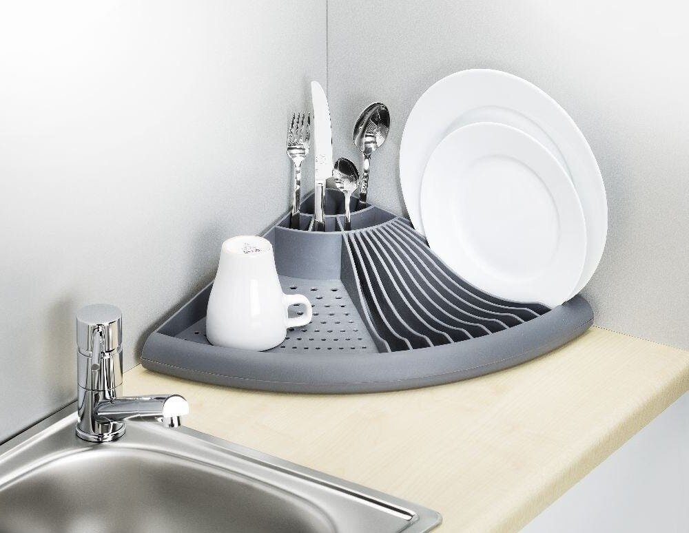 если у вас нет необходимости сушить посуду на столе, но есть куча баночек, бутылочек, которые необходимы под рукой, то угловые полки вас спасут.