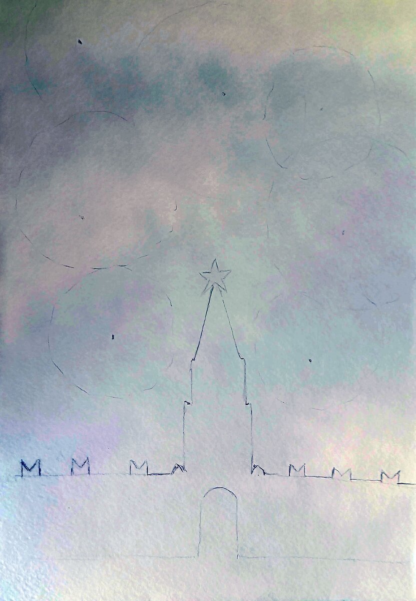 В честь празднования 75-летия Победы родилась идея выполнить работу по данной теме. Работа проста в исполнении, думаю, подвластна даже начинающему художнику. Вам понадобится: акварельная бумага (лучше очень плотная, как картон) формат А4, акварель, кисти (белка или синтетическая, среднего размера и тонкая (№ 3)), пластиковая палитра (или плоская белая керамическая тарелка), баночка с водой (0.5 л), поваренная соль, простой карандаш, клеенка ф А3, ластик. 1. В начале нарисуйте простым карандашом силуэт здания (башню со стенами Кремля). Мысленно поделили лист на две половины: нижнюю и верхнюю. Работаем с нижней. Для этого нашли центр в листе и провели вниз вертикальную линию до конца листа, нижняя третья часть - стены, отделяем их горизонтальной чертой, на одинаковом расстоянии друг от друга намечаем зубцы, 2/3 высоты составляет - башня, ее рисуют ступенями снизу вверх: основание пошире, к вершине- утончаем, завершаем звездой, намечаем ворота. Затем нужно тонко наметить контуры салютн