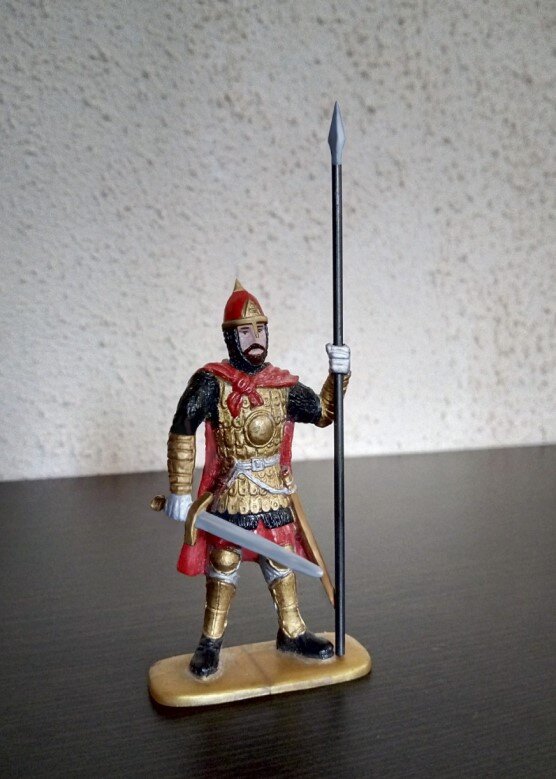 И кого же нам представить в нашей солдатской рубрике, сегодня, в День Великой Победы? – ну конечно, прославленного русского полководца – князя Александра Ярославовича, свет, Невского! Он, конечно, не маршал Советского Союза, и не брал Берлин, однако немчуру тоже бил знатно! Первое, что нам сыном резануло глаза, когда мы извлекли его из коробки, это явно чужеземное копьё с флажком ордена госпитальеров, зачем-то врученное нашему русскому князю заводом-изготовителем. Они там что, вообще различий не делают, кого чем вооружать?? Ну и конечно же, заводская окраска, традиционно, не впечатлила… Не-не, решили мы с сыном. Это непорядок! Басурманский штандарт был изъят у солдатика, а вместо него мы изготовили нормальное копьё с ромбовидным наконечником. Как и в предыдущих переделках, древком стал отрезок вязальной спицы, а наконечник был выточен из застывшей капли двухкомпонентного клея «Поксипол». Из клея же, «ювелирно», сформировали на шлеме личинку-наносник, и острое навершие шлема. Раскраши