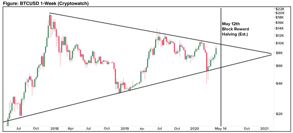 Аналитики Kraken обнародовали отчёт о состоянии рынка криптовалют, изначально подготовленный для VIP-клиентов биржи. По их словам, хешрейт и темпы распространения коронавируса являются ключевыми метриками, за которыми необходимо следить инвесторам в преддверии халвинга. Если хешрейт будет расти, а распространение коронавируса замедлится, биткоин имеет все шансы продолжить подъём, считают они. «В случае сохранения текущей динамики биткоин может подняться до нового локального максимума выше $10 500 и выйти из многолетнего даунтренда. Биткоин беспрерывно растёт в течение семи недель, после того как обвалился примерно на 50% до $3 900 в середине марта», – говорится в отчёте. Согласно Kraken, биткоин продолжает торговаться в симметричном треугольнике, возникшем на его графике после максимумов 2017 года. «Ожидается, что тестирование сопротивления приведёт либо к бычьему прорыву, который положит начало новому макротренду, либо к отказу, в результате которого цена вернётся к уровню поддержки о