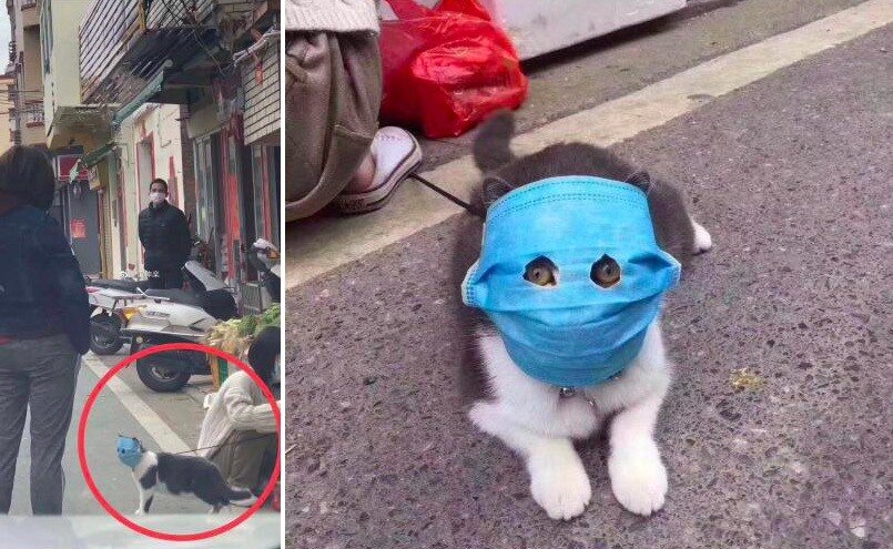 9 февраля 2020 года пользователь 里神楽 выложил в крупнейшей китайской соцсети Weibo фотографию кота в медицинской маске. Животное на поводке выгуливали на улице. Чтобы кот мог что-то видеть, хозяева сделали прорези на глазах. Медицинские маски используют в Китае и других странах для защиты от коронавируса. Доказано, что маски только помогают людям, которые уже заболели, не распространять вирус дальше. Защитить от заражения маска не может, ведь она не закрывает глаза. А именно глаза – один из основных каналов проникновения вируса в организм.