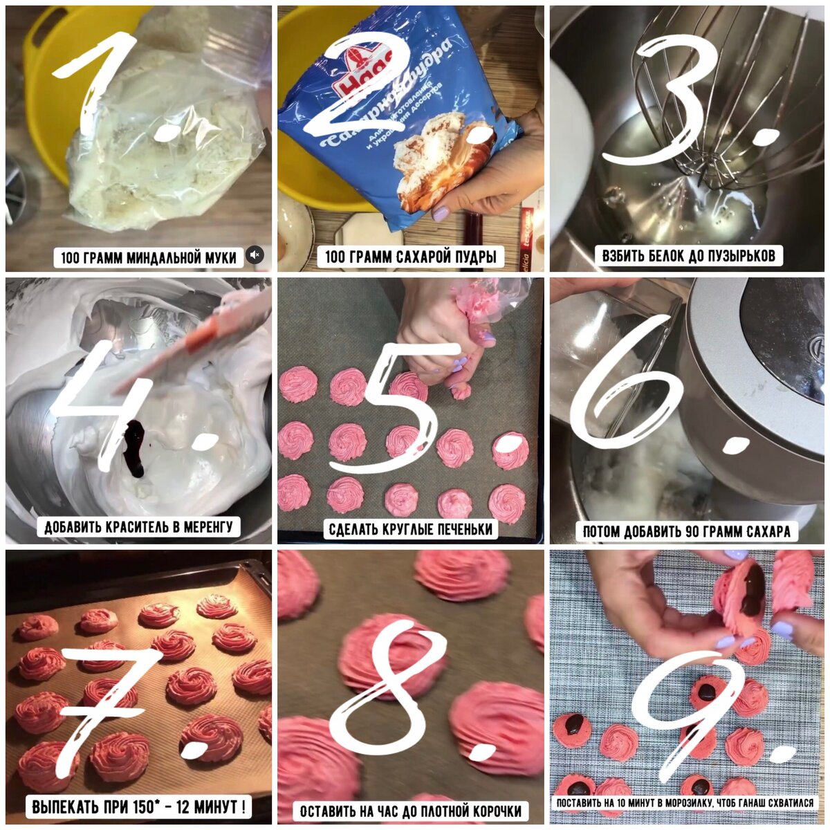 Приступим: 1. просеять миндальную муку и сахарную пудру в чистую и сухую чашу. 2. белки взбить до пузырьков, постепенно добавляя сахар, до устойчивых пиков. 3. в белковую массу добавить каплю красителя - перемешать. 4 соединить белки с мукой и сахарной пудрой, смешивать обязательно ЛОПАТОЧКОЙ! 5. долго не вымешивать, переложить тесто в кондитерский мешок. 6 на лист выстелить пергамент и карандашом нарисовать кружочки (обвести рюмку), чтобы половинки были ровные. 7. делаем круглые печеньки и оставляем их стоять час при комнатной температуре, верх станет плотным. 8. ровно через час поставить печенья в разогретую до 150 градусов духовку и выпекать ровно 12 минут !!! Засечь время обязательно, если передержать они станут сухими. Ганаш: 100 грамм молочного шоколада, 30 грамм сливочного масла и 15 грамм сливок 22%, подогреть на водяной бане либо в микроволновке - смешать - выложить в кондитерский мешок - и поставить остужаться в холодильник или морозильник 1,5-2 часа. 9. на готов
