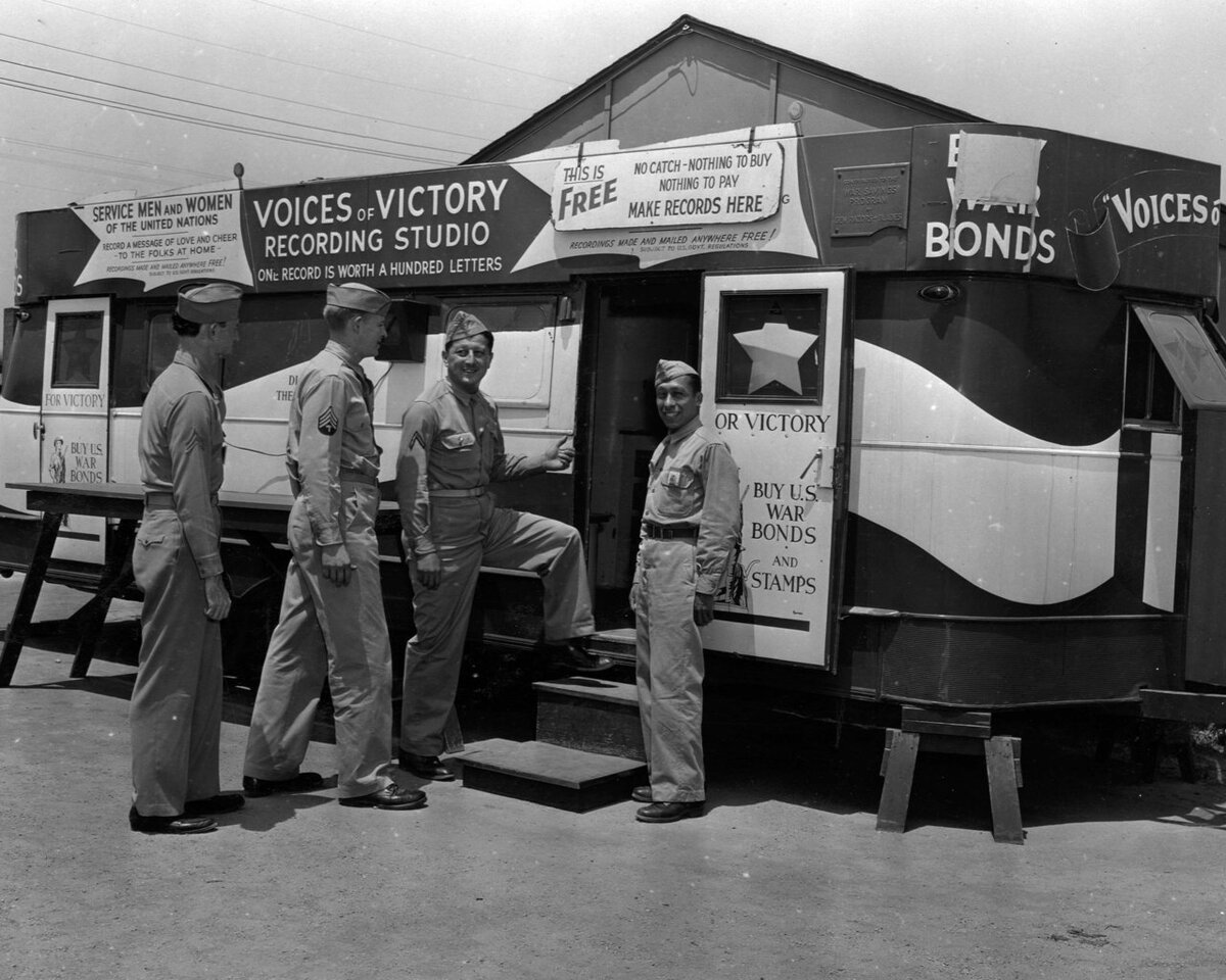 Источник фото Во время Второй мировой войны в США действовала сеть мобильных студий звукозаписи, где любой солдат мог бесплатно записать на пластинку звуковое письмо и отправить его своим близким. Такие студии-фургончики устанавливались в военных тренировочных центрах. В студии находился «репортёр» - звукооператор, который и осуществлял запись. Пластинки были красочно оформлены и назывались «Voices of Victory» – «Голоса Победы». Этот сервис был организован производителем безопасных бритв и станков American Safety Razor Corporation Gem Blades - основным конкурентом фирмы Gillette.