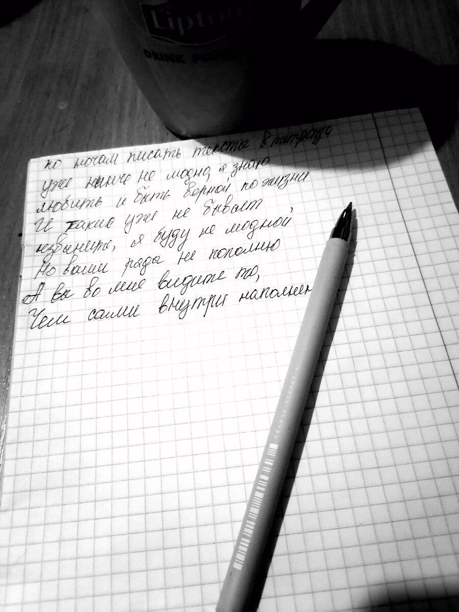 По ночам писать тексты в тетради... Уже нынче но модно, я знаю Любить и быть верной по жизни? И таких уже не бывает... Извините, я буду не модной Но ваши рядф не пополню. А вы во мне видите то, Чем сами внутри наполнены. "Твоя повседневность"