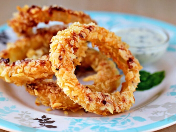 Привет! Наверняка во время карантина вы все не раз объедались чипсами и другими закусками за просмотром фильма. Но настало время приготовить свою закуску, чтобы наконец разнообразить свой "киношный рацион"! Кстати! Эти колечки отличный повод заглянуть в мой рецепт соусов! Они просты в приготовлении, но очень вкусные. Отлично подойдут к этим колечкам, тебе остается только выбрать :) Тебе понадобится: 100-150 гр муки; соль; молотый перец (я добавляю и чили, люблю поострее); 250 мл йогурта; 2 яйца; несколько луковиц (смотря сколько хочешь колечек); растительное масло; картофельные чипсы Приготовление: 1) Возьми две миски, а затем приготовь муку: насыпь ее в стакан, в котором будешь отмерять нужную порцию. В первой смешай муку (засыпь туда чуть больше половины стакана),