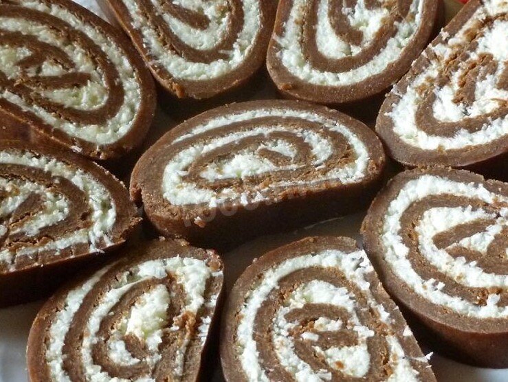 Очень вкусный рулет. Как "Баунти". Нежный, попробуйте. Продукты доступные и их не много! Для теста: печенье-250 гр. какао-3 стол. ложки сахар-3 стол. ложки молоко-150 мл. Для начинки: кокосовая стружка-150 гр. сахарная пудра -100 гр. слив масло-120 гр 1. Печенье измельчили в крошку, добавили какао, в теплом молоке растворили сахар, все соединили, собрали тесто в комок. Накрыть. 2. Мягкое сливочное масло взбить до пышности, всыпать пудру, еще взбить. Добавить стружку и перемешать. 3. Тесто тонко распределить на пленке, сверху положить крем, скрутить плотный рулет, в холодильник на 2 часа или в морозилку на час. Согласитесь, что просто рулет делать. А вкусный какой). Вас обязательно похвалят). И без возни, как я люблю) Подписывайтесь. У меня все рецепты быстрые, но все вкусные.