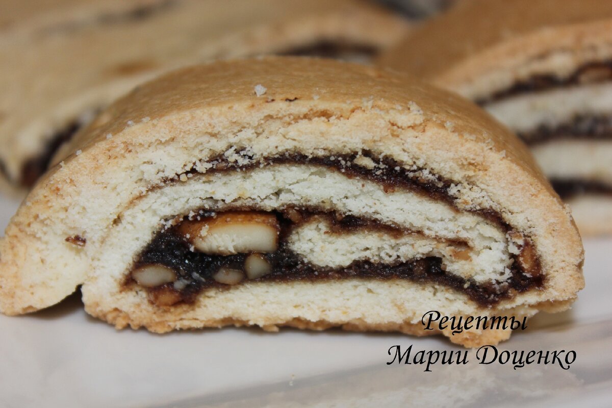 Положить рулеты на застеленный пергаментом противень и выпекать печенье в заранее разогретой до 180 градусов духовке до красивого румяного цвета.
