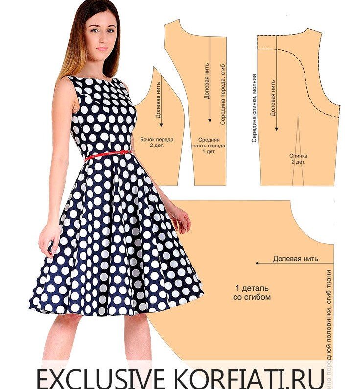 Это очаровательное платье с юбкой клеш просто создано для стройных юных леди. Крупный белых горох и контрастный темно-синий фон ткани добавляют платью игривости и свежести, красный кожаный поясок подчеркивает тонкую талию, а пышная юбка клеш так и приглашает покружиться! Но самое приятное — выкройка платья с юбкой клеш — очень простая, так что смоделировать и сшить эту модель не составит большого труда даже для начинающих мастериц. Для моделирования лифа платья, вам потребуется базовая выкройка платья с нагрудной вытачкой. Можете скачать базовую выкройку платья на 5 размеров или построить базовую выкройку платья самостоятельно, используя ваши мерки. Представленная модель выполнена из хлопкового сатина, по переду смоделированы рельефные швы от проймы, по спинке — вытачки, вырез — «лодочка». Длина платья от талии — 60-65 см. Читать полностью материал на сайте - https://korfiati.ru/2018/04/vyikroyka-platya-s-yubkoy-klesh/