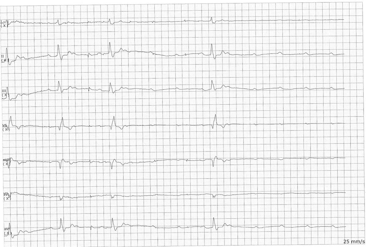 Эти ЭКГ, показанные ниже, записаны у одного и того же пациента. Запись начинается с регистрации АВ-блокады 2 степени второго типа - далеко зашедшая (проведение 3:1). Интервалы PR в проведенных комплексах одинаковые. Желудочковые комплексы с морфологией блокады правой ножки и, вероятно левой задней. Далее, АВ-блокада усугубляется (4-й QRS) до 4:1 и 6:1 (5-й QRS), снова 4:1, а затем желудочковая активность полностью исчезает, и пациент переходит в асистолию желудочков с зубцами P (9 зубцов P подряд без желудочковой активности).