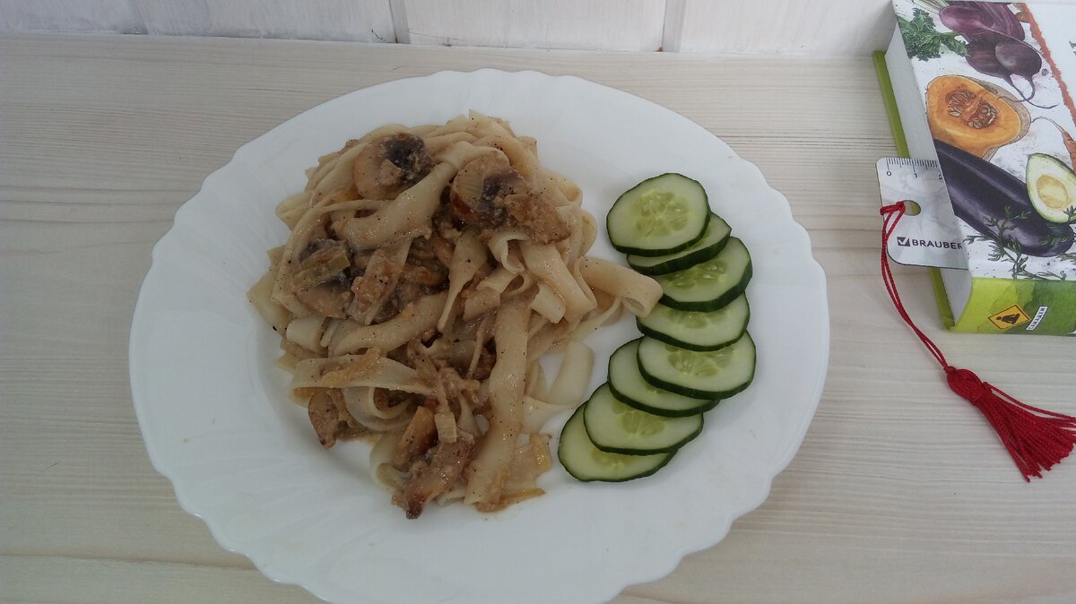 Когда соус станет гуще, перемешиваю с лапшой и на пять минут оставляю под крышкой, чтобы лапша подружилась с грибами 😁.