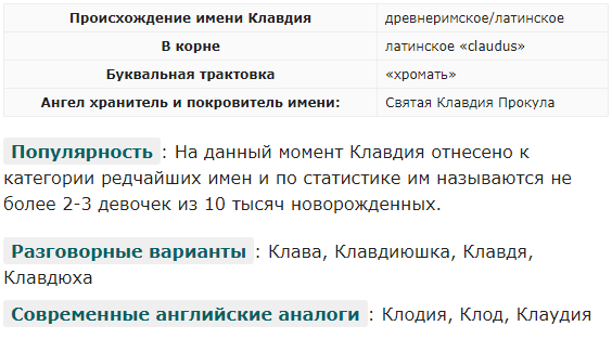 Женское имя Клавдия имеет древнеримское происхождение. Было образовано от латинского слова «claudus», в переводе на русский означает «хромать». Это же слово лежит и в корне мужского родового имени римлян «Клавдий», породившего и женскую форму имени. Было особенно популярным в прошлом веке, сейчас встречается довольно редко. Интересное значение наделяет носительниц имени Клавдия сочетанием уникальных качеств характера. Большинство Клавдий обычно, это активные и веселые, энергичные и балованные девушки, которые просто не представляют свою жизнь без постоянного общения с людьми. Носительница имени Клавдия честная и преданная, поэтому на дух не переносит предателей и льстецов.