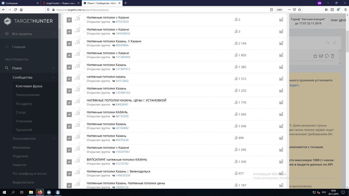 Если нам нужен клиент, например, на натяжные потолки в городе Казань, мы находим группы Вк, связанные с натяжными потолками («Натяжные потолки Казань»).