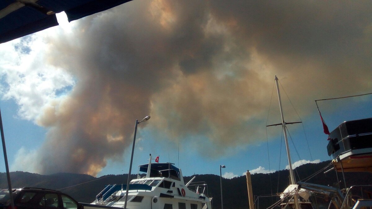 Разбудил запах гари: со стороны Бозбуруна над горами облака желтого дыма, лесной пожар. Через полчаса на балконе появился пепел, в небе загудели вертолеты. Снимал с балкона: красиво и жутко.