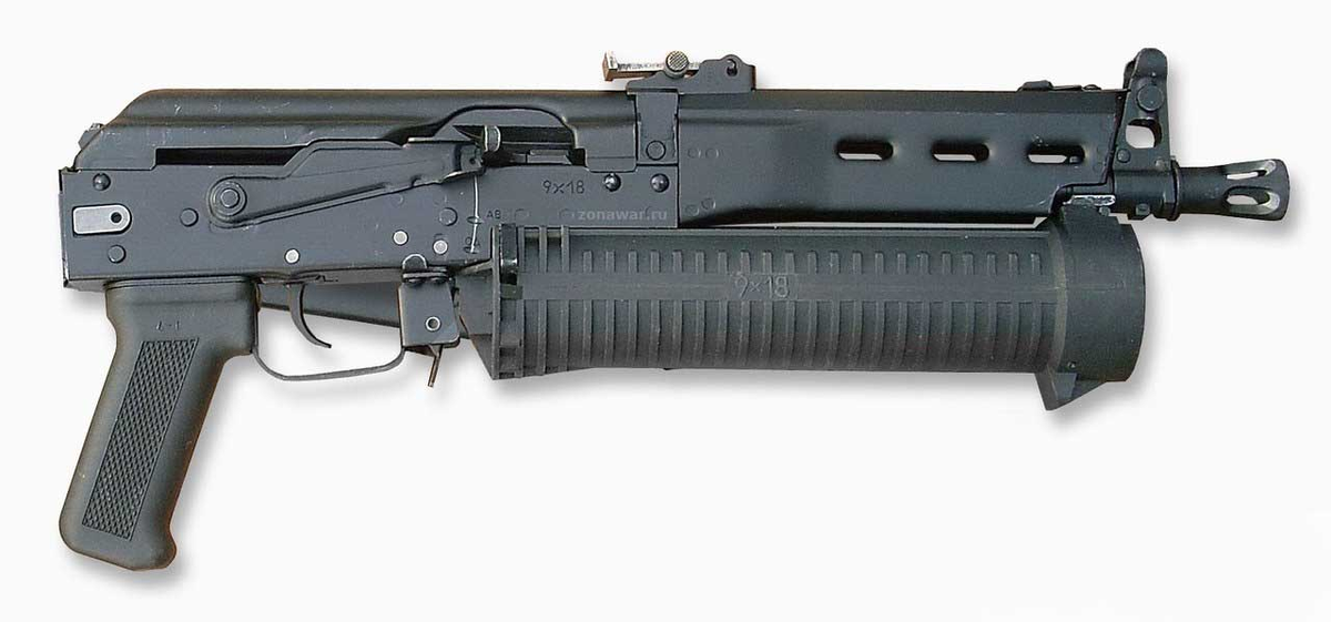 Пистолет-пулемет ПП-19 "Бизон" был разработан в 1993 году на Ижевском Механическом Заводе по заказу МВД. Этот пистолет-пулемет примечателен, по меньшей мере, по двум причинам: - во-первых, ПП-19 "Бизон" является первым пистолетом-пулеметом, разработанным на базе автомата Калашникова. - а, во-вторых, этот пистолет-пулемет разработан Виктором Калашниковым (сыном М. Т. Калашникова) и Алексеем Драгуновым (сыном Е. Ф. Драгунова). Пистолет-пулемет ПП-19 во многом унифицирован с автоматом Калашникова, но магазин шнекового типа является несомненным влиянием американского Calico, но со значительным отличием - магазин расположен не сзади сверху, а спереди, под стволом, на манер цевья, обеспечивая удобство удержания пистолета-пулемета при стрельбе. На базе пистолета-пулемета ПП-19 разработаны следующие модификации: - Бизон-1 — модификация с мушкой от СВД, секторным прицелом с тремя отметками (50, 100 и 150 м), рукоятью взведения затвора справа и складным влево прикладом от АКС-74У. Пистолетная