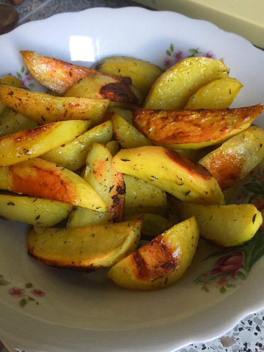 Очень простой рецепт вкусной картошки. Ингредиенты: 1,3 кг картофеля (или 1 кг чищеного картофеля без кожуры) 5 ст.л.растительного масла Специи: 1ч.л. без верха сладкой паприки 1ч.л. без верха куркумы 1 ч.л. без верха соли 0,3 ч.л. сухой чеснок 0,5 ч.л. горчицы сухой или 1 ч.л. без верха готовой кориандр черный перец тимьян майоран укроп Рецепт: Чистим и моем картофель. Режим каждую картофелину примерно на 8 долек. Добавляем специи, масло, всё хорошо перемешиваем. Выкладываем на противень и ставим в духовку при 180 градусах на 40 - 50 минут. Картошка по деревенски готова! Приятного аппетита!