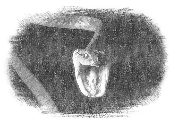 До полуночи оставалось ещё минут сорок когда чародей тайком подобрался к воротам и замер в паре метров от них, стараясь ни чем не выдать своего присутствия. Свисавшие ветви яблони, что удачно росла у забора, скрывали его от особо зорких глаз возможно уже изучавших улицу. В томительном ожидании прошла целая вечность прежде чем Платон услышал какой-то звук. Показалось... Показалось или нет, но что-то было не так. Чародей напрягся. Вот! Совсем рядом. Снова... шорох, будто ползёт кто. Платон скосил взгляд влево на большую ветку, сантиметров в тридцати от себя, нависавшую над самым забором, откуда доносился звук. По ветке, едва различимая взглядом, ползла громадная змея. Когда ветка начала прогибаться под её весом, змея остановилась, опустила голову на ветки с листьями и замерла.