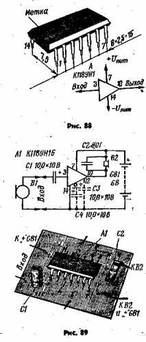 Первый опыт с микросхемой К118УН1А (или К118УН1Б) проводи по схеме, приведенной на рис. 89. В качестве монтажной платы используй картонную пластинку размерами примерно 50X40 мм.