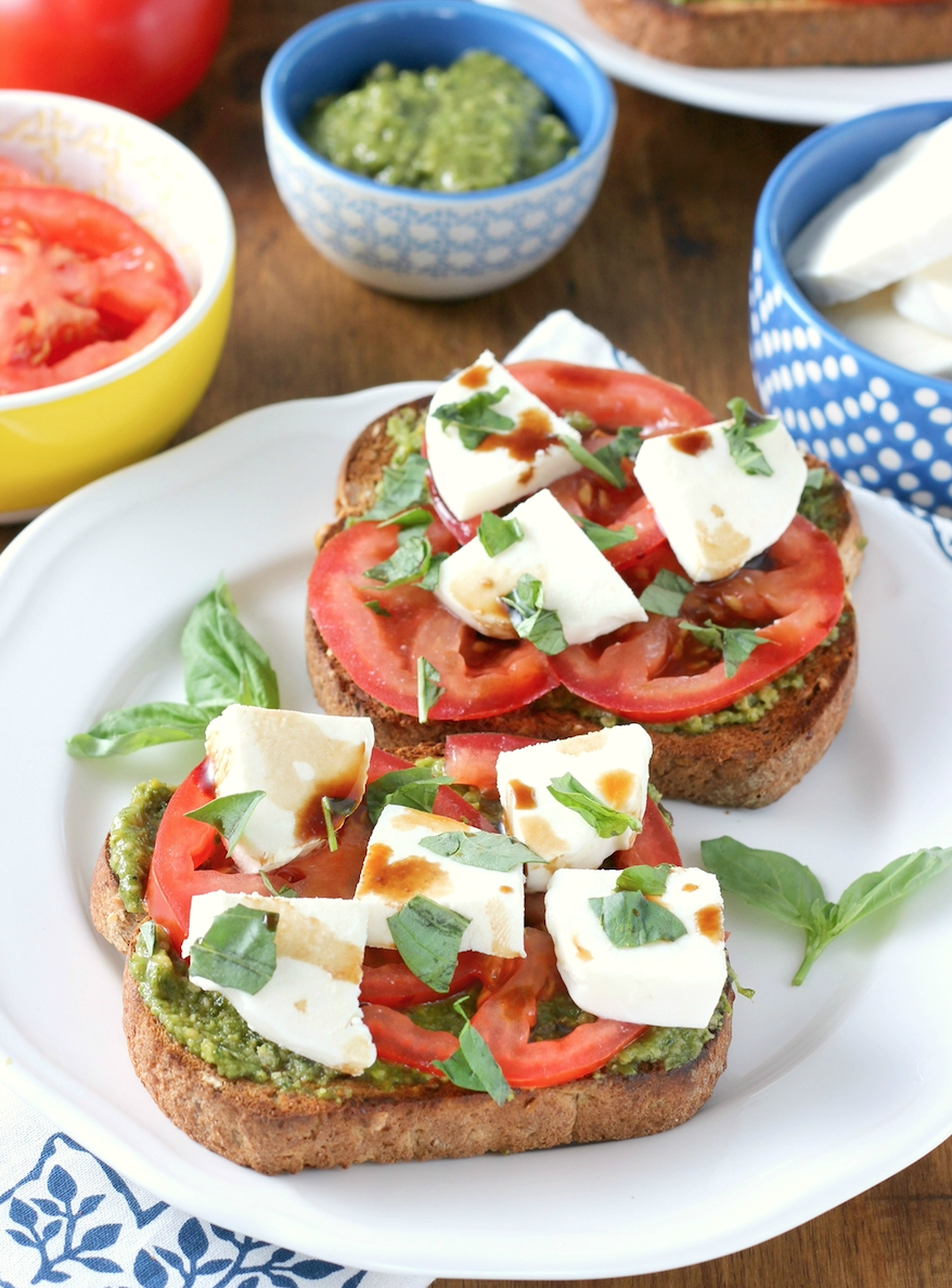 На завтрак, обед, перекус на работу или в школу- эти полезные и простые в приготовление тосты идеальная идея для любого случая. Готовятся легко, понравятся всем. ИНГРЕДИЕНТЫ: 4 ломтика цельнозернового хлеба 2 1/2 столовых ложки песто 2 маленьких или 1 большой помидор, тонко нарезанный 4 ломтика свежей моцареллы, нарезанной на кусочки 2-3 листика базилика, разорванных на кусочки бальзамический уксус или бальзамический крем ПРИГОТОВЛЕНИЕ: Поджарьте хлеб на сухой сковороде или в тостере. Намажьте песто на хрустящие ломтики, выложите сверху помидор и сыр моцарелла. Украсьте бутерброды небольшим количеством базилика , посолите по вкусу и сбрызните бальзамическим соусом. Готово! Можно подавать!