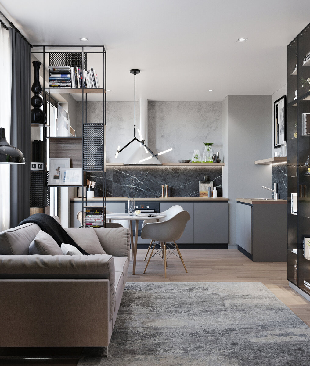 Кухню отделили открытым стеллажом. Он также предоставляет место для минимально хранения и предметов декора. Угловой гарнитур разместили вдоль всей стены. Фасады шкафов подобрали в более насыщенном сером оттенке, нежели цвет стен.
