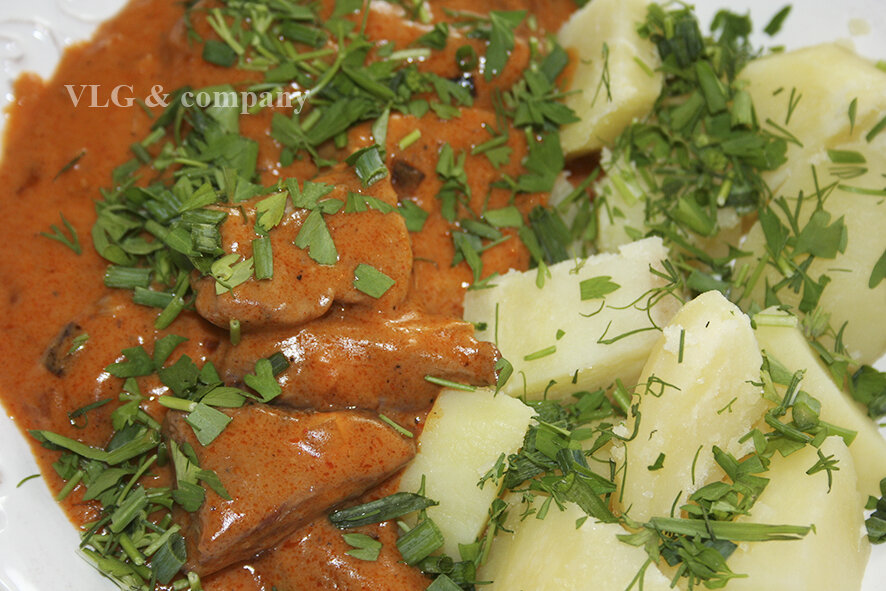 Кладём вареную картошку, половником выкладываем наш бефстроганов обязательно с соусом и посыпаем рубленой зеленью. Все готово!