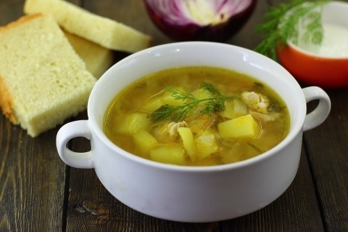 Для приготовления супа с солёными огурцами нужно подготовить воду, картошку, морковь, лук, солёные огурцы, масло подсолнечное, куриное мясо, лавровый лист, соль, молотый перец, корень петрушки, корень сельдерея.