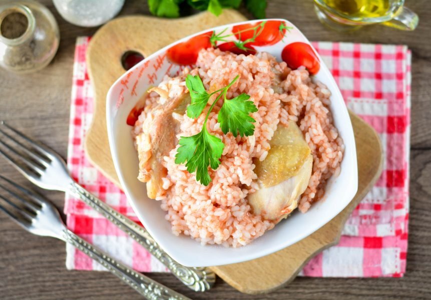 4. Влейте томатный соус, перемешайте и тушите под крышкой еще 10–12 минут до полной готовности риса и мяса. Поперчите по вкусу. Блюдо готово. Сразу подавайте к столу.