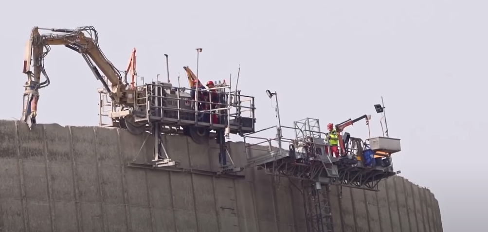 Самый простой и быстрый и экономичный способ избавиться от старого здания, это использовать взрывчатые вещества. Однако когда сооружение находится вместе неподходящим для взрывов, иногда приходится проявить изобретательность. На фото снос 162 метровой градирни атомной электростанции. После долгих размышлений, специалисты пришли к выводу что единственный возможный способ справиться с задачей - механический. Именно так тяжёлый полноценный экскаватор оказался на многометровой высоте, примечательно что находиться внутри кабины человеку было слишком опасно, а потом оператор управлял машиной дистанционно.