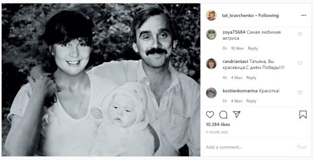 Татьяна Кравченко часто делится с поклонниками в соцсети интересными кадрами из своей жизни. На этот раз она опубликовала черно-белый семейный снимок, который был сделан более 30 лет назад. На нем еще молодая Татьяна позирует рядом с бывшим мужем Дмитрием Гербачевким. На руках знаменитость держит маленькую дочь Анну.