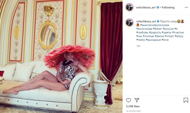 Эпатажная российская балерина Анастасия Волочкова удивила полуобнаженным образом 44-летняя балерина любит похвастаться своей внешностью и регулярно поражает аудиторию смелыми выходками. На этот раз она опубликовала снимок в странном головном уборе. Анастасия Волочкова нарядилась в экстремально короткое платье с изображением тигра, а ее ноги оказались полностью обнажены. Звезда еще и задрала их на диван. Больше всего на фотографии привлекает внимание то ли шляпа, то ли зонт, который Волочкова напялила на голову. Кроме того, она призывно прикоснулась пальцами к губам. Пользователи социальной сети высмеяли Анастасию в комментариях за нелепый стиль. Многие также поразились внешности уже немолодой танцовщицы: "Странно, что ноги не раздвинуты"; "Настасья балетную пачку нахлобучила на голову 😂😂😂👏👏👏👏👏"; "А что с ней? Пачка на голове! От кого-то спряталась? Ку- ку!!😂👎"; "Мухомор по кличке "Настя, а вот и я в трусах и шляпе"; "🙄а почему ноги все в сетке венозной?".