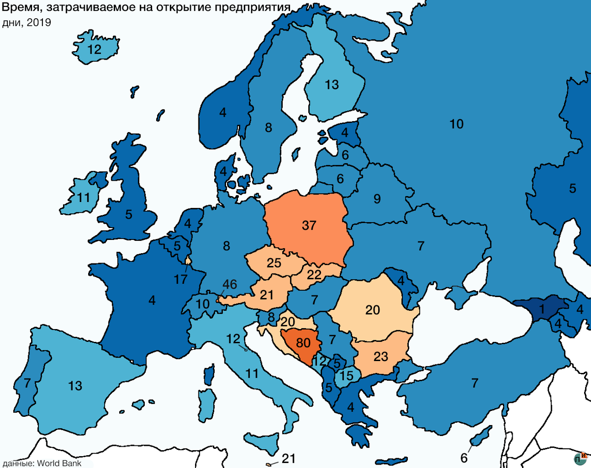 При вычислении уровня деловой свободы и выставлении оценок, помимо целого ряда других характеристик, учитывается время, которое предприниматели разных стран тратят на оформление документов и взаимодействие с государственными органами при открытии своего предприятия. Используются данные Всемирного банка из рейтинга Doing Business. Конечно, государства, ориентированные на развитие, поощряют предпринимательскую активность и стремятся максимально сократить бюрократическую волокиту, а также упростить и автоматизировать процесс работы с предпринимателем там, где это возможно. На 2019 год в мире организационные процедуры занимают в среднем 19,6 дня