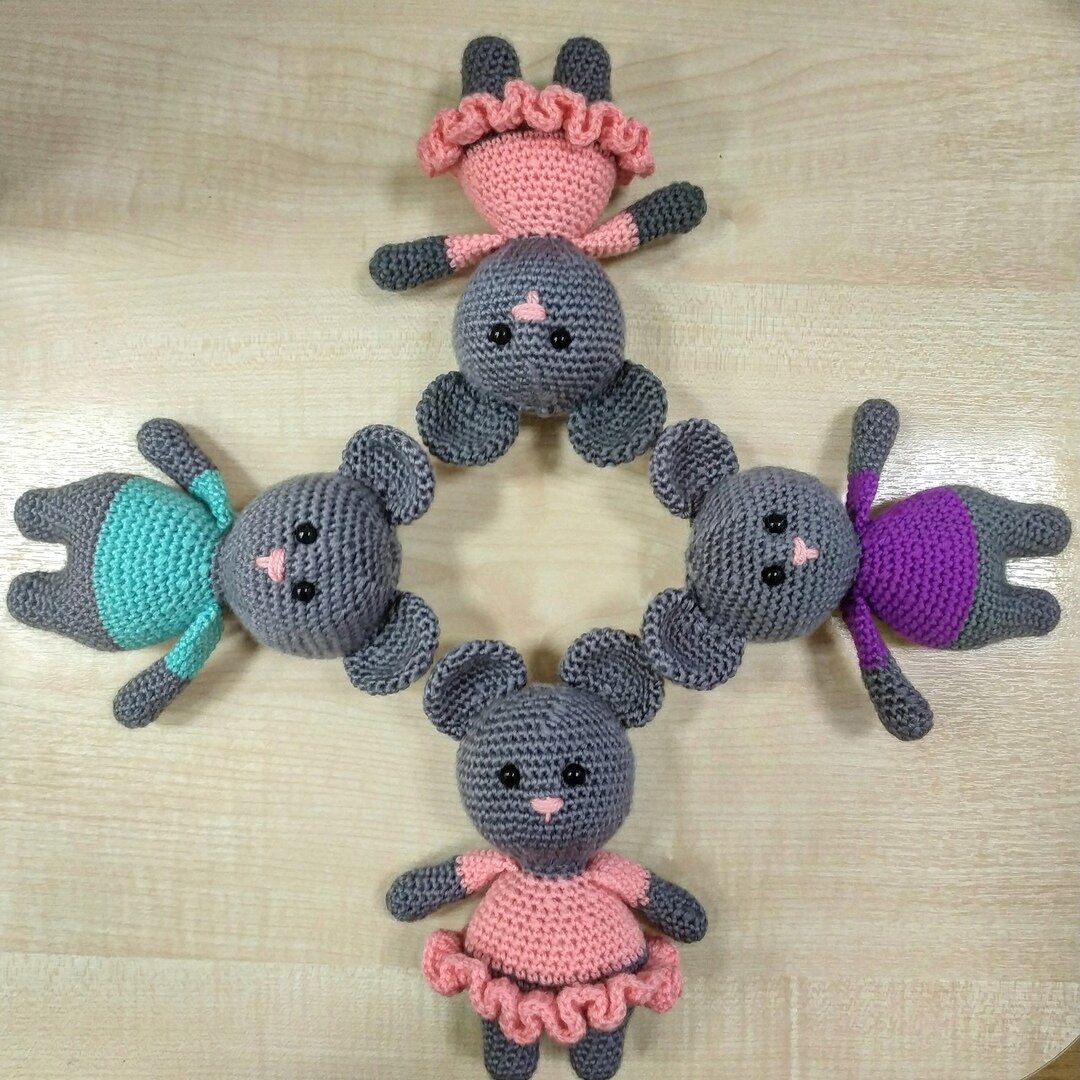 Сколько мышат нужно для полного счастья? 1. Общий обзор на игрушки тут. 2. Колобок, поросята и мышь живут здесь. 3. Братцы зайцы и хитрый лис. 4. Помощник Санта Клауса - Олень Рудольф, собственной персоной. 5. Зайка-балеринка. 6. Шапка для девочки Минни Маус. 7. Новогодняя собачка 8. Нежная собачка амигуруми 9. Мятная собачка амигуруми 10. Собачка в апельсинах 11. Огни маленькой собачки 12. Апельсиновая собачка 13. Собачка Апельсинка 14. Мышата амигуруми Мышиное семейство к Новому году Связана по МК из интернета Пряжа 100% акрил: Детская новинка и огонёк Наполнитель: синтебух Безопасные глазки Высота около 18 см Я решила составить подборку, как научиться вязать и что для этого требуется, помимо упорства и усидчивости: 1. Синтепух (его можно купить, как в обычных магазинах для хобби, так и в онлайн-магазинах в большом количестве, я когда-то заказала напополам 8 кг - до сих пор им пользуюсь))) 2. Безопасные глазки (магазины для хобби - велкам, но там дороже, поэтому я заказываю на Али